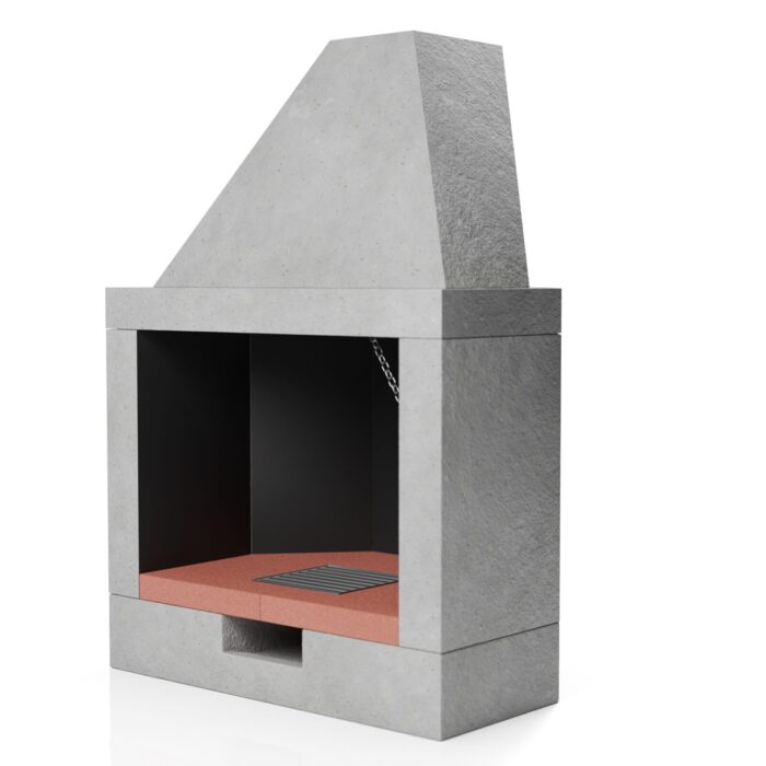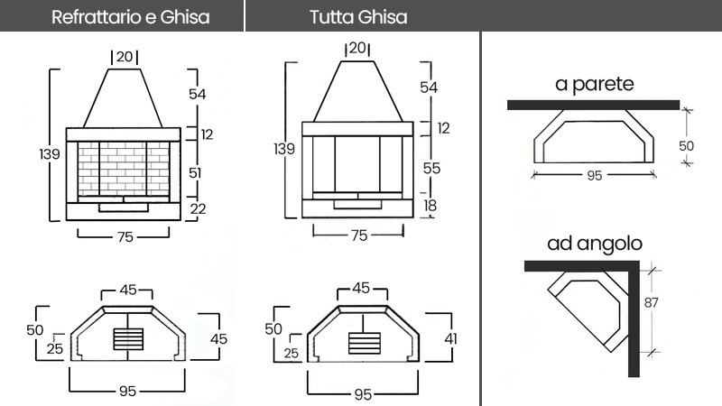 E’ disponibile in tre versioni differenti; refrattario, pareti ghisa e piano refrattario, pareti e piano fuoco in ghisa. Dotato di registro fumi con catena e cassetto raccogli cenere con griglia in ghisa.