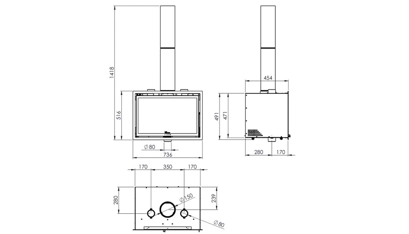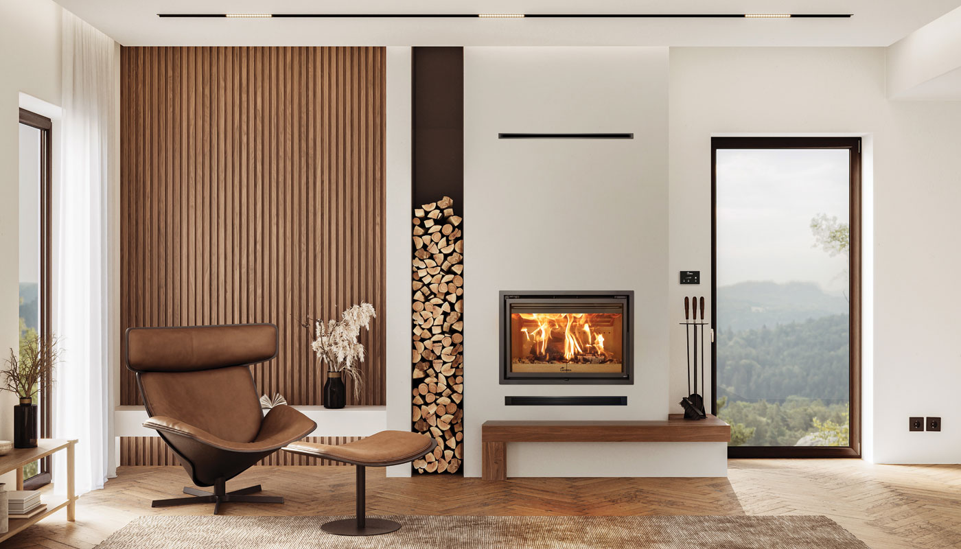 La camera di combustione, ad alta capienza, consente di ospitare ceppi di legno lunghi più di 50 cm e ha una profondità di carico della legna maggiorata del 20%. Tutti gli accessori sono inclusi: cornice di finitura a 4 lati, sistema di ventilazione forzata a 5 velocità (automatico e manuale) con telecomando a distanza e modalità silenziosa (ventilatore spento, approfittando della convezione naturale).