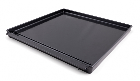 Piastra con bordi su tre lati e canale di raccolta liquidi nella parte frontale.