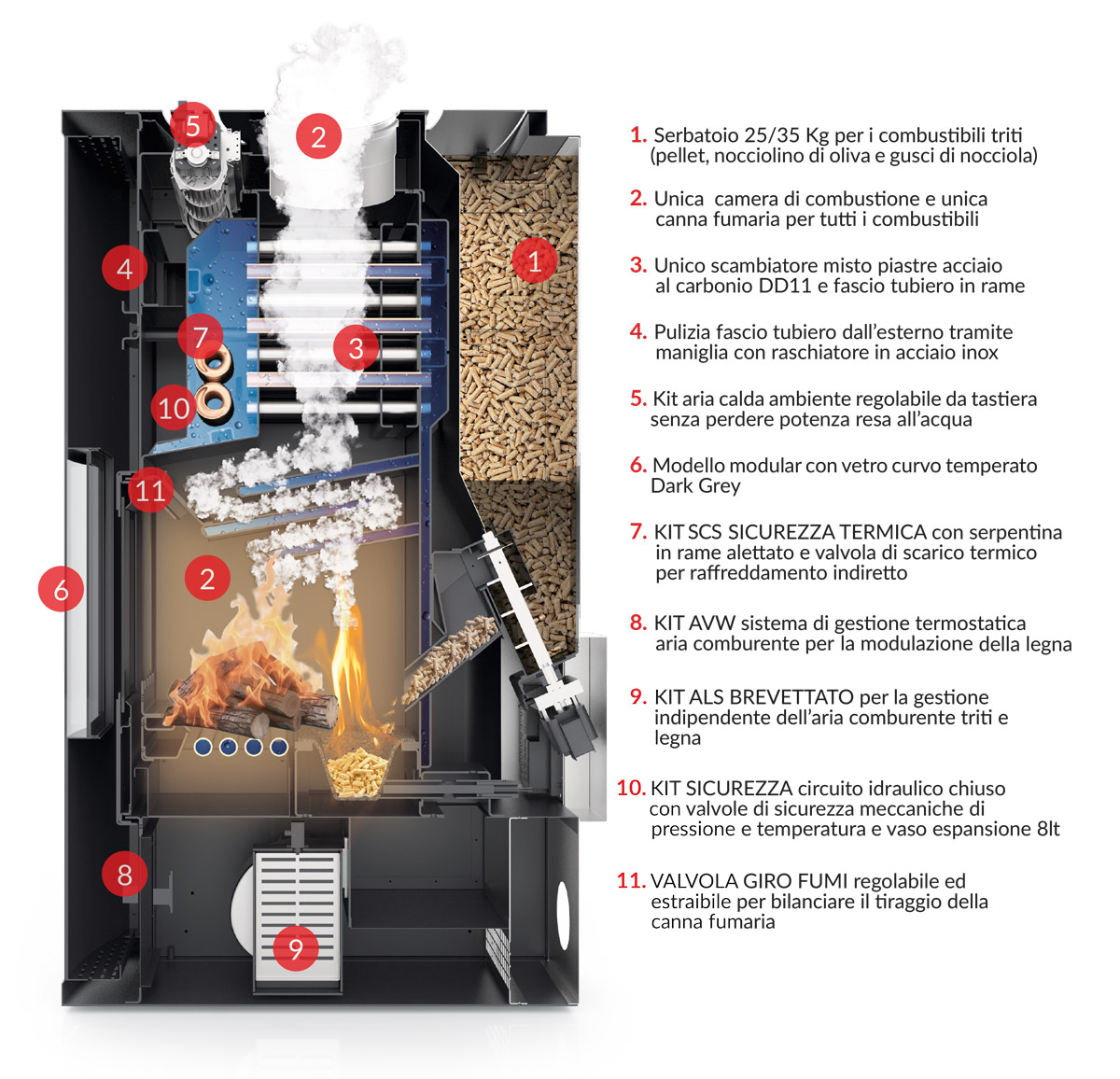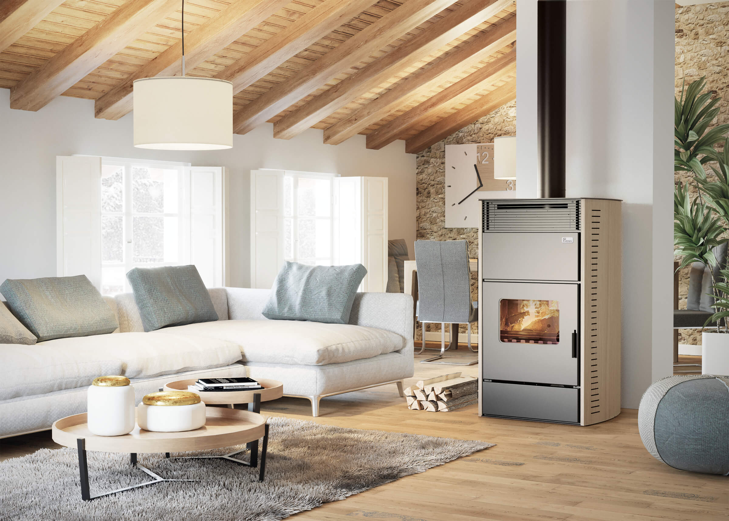La termostufa combinata Plurifire rappresenta l’eccellenza tecnologica di Fuego nel settore del riscaldamento a biomassa, offrendo un sistema integrato capace di operare con la massima efficienza sia a legna che a pellet. Grazie al suo design raffinato e alla struttura robusta, si inserisce armoniosamente in ogni ambiente domestico, trasformandosi nel cuore termico dell’abitazione.